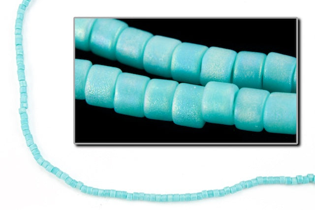Size 10/0 matte opaque iridescent green turquoise cylinder seed bead.