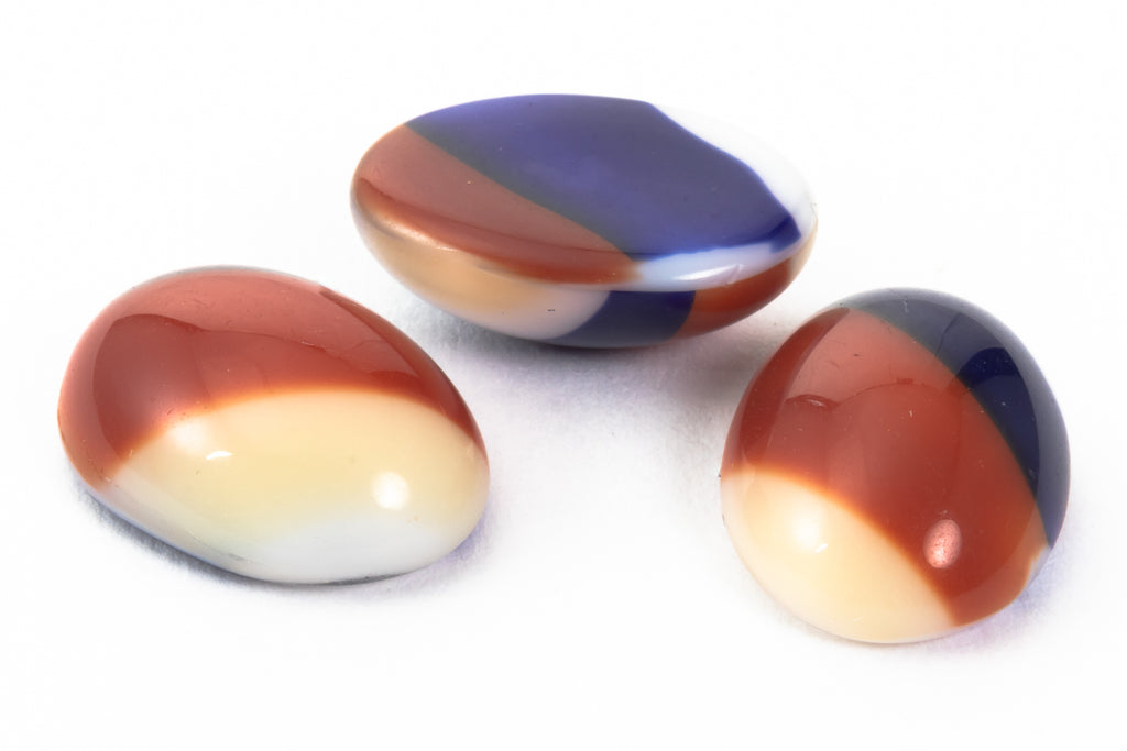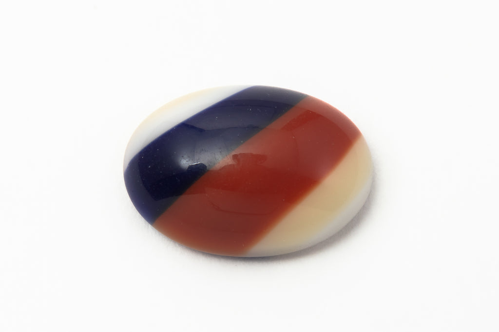 10mm x 14mm oval flat back with diagonal bands of beige, red brown and Navy blue.