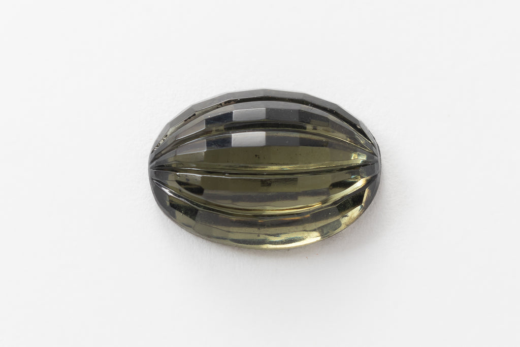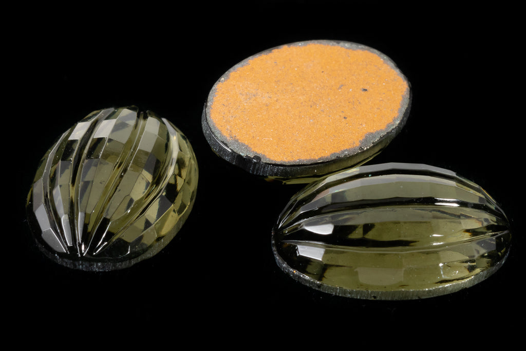 9.8mm x 13.97mm black diamond oval with faceted ridges running lengthwise. Gold-foiled flat back.Made in the Czech Republic circa 1970's. Sold individually.