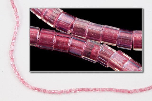Size 11/0 shimmering rose lined crystal hex cut cylinder seed bead.