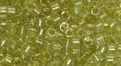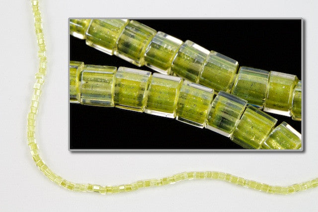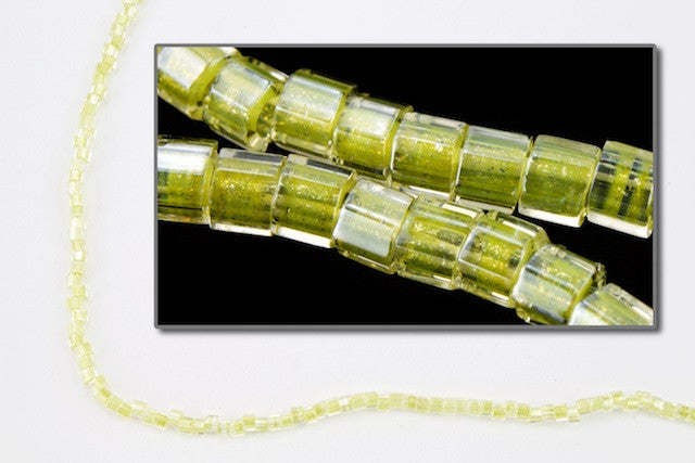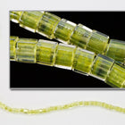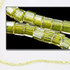 Size 11/0 shimmering light olive lined crystal hex cut cylinder seed bead.