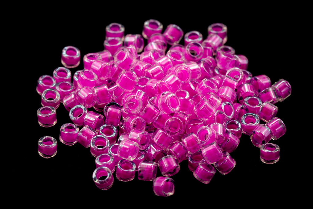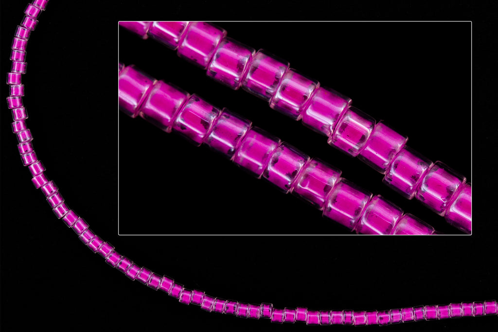 Size 11/0 luminous hot magenta cylinder seed bead.