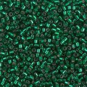Size 11/0 silver lined dyed emerald cylinder seed bead.