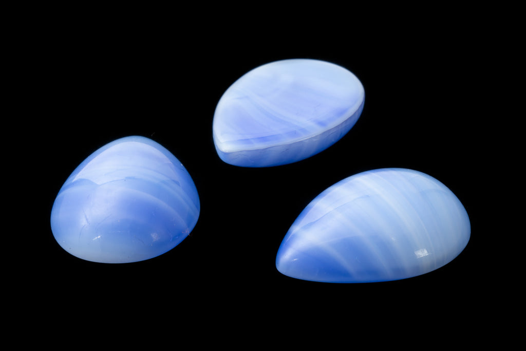 11.04mm x 15.15mm flat back pear cabochon.Opaque medium blue with white striations.
