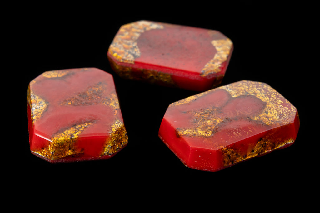 Opaque red with gold foil inclusion.Made in Germany or the Czech Republic in the 1960's or earlier.Sold individually.