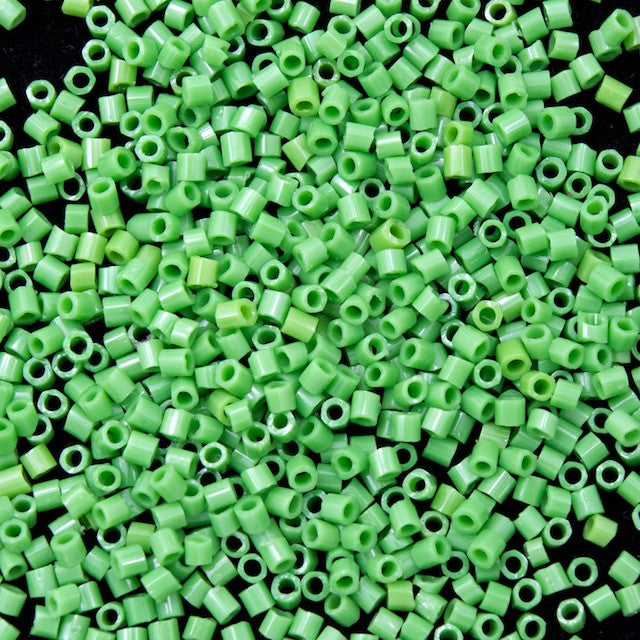 1mm x 1.4mm size 15/0 opaque pea green hex seed bead.