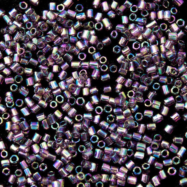 1mm x 1.4mm size 15/0 transparent dark mauve hex seed bead with AB finish.