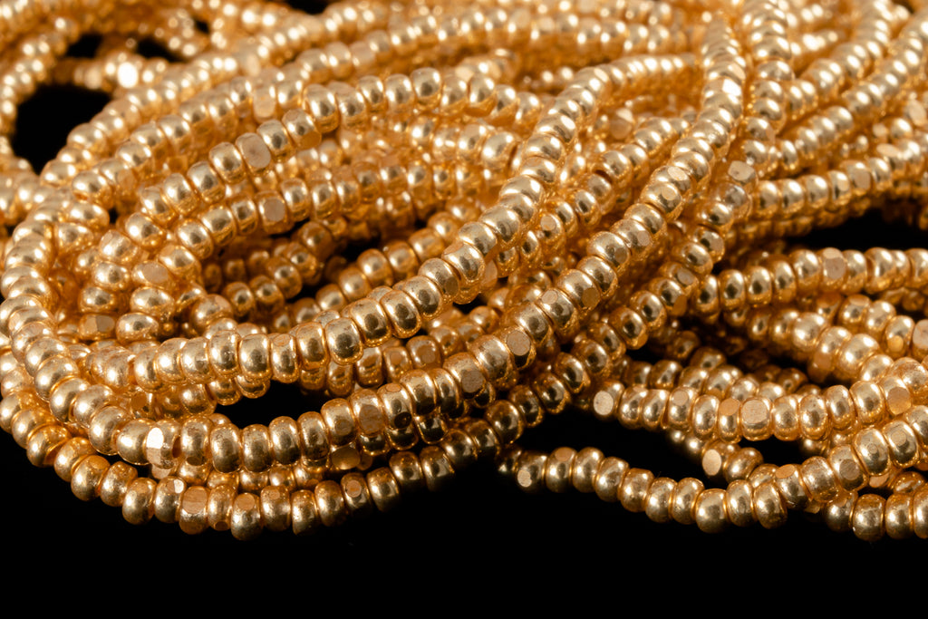 Size 11/0 Charlotte cut metallic light gold glass seed beads.