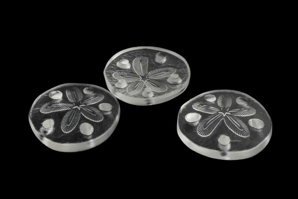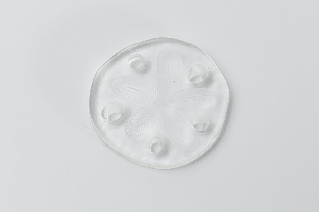 18.5mm matte crystal round flat sand dollar with 5 holes.