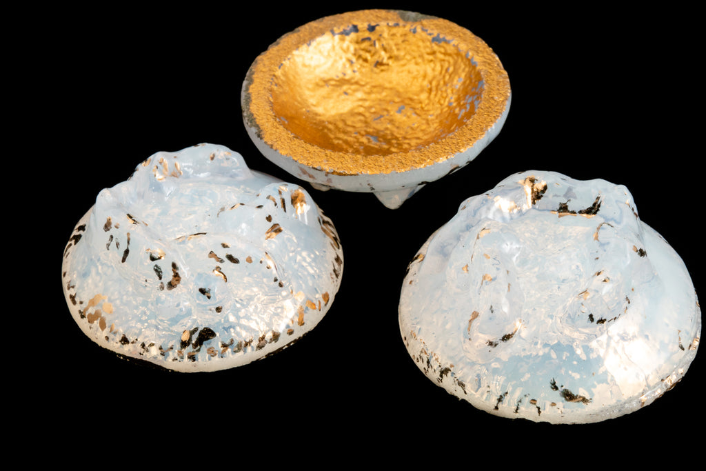 18.03mm opal white domed round flat back with raised rope texture and gold accents.