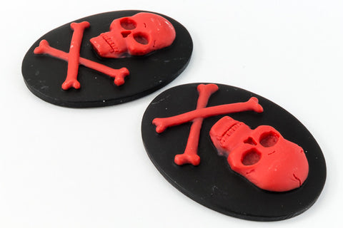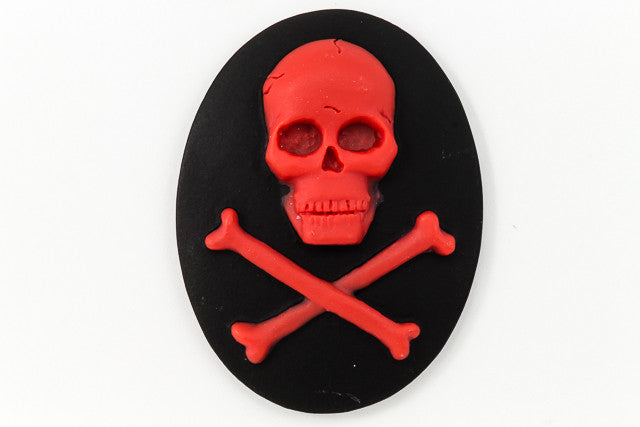 30mm x 40mm Lucite oval cameo with red detailed skull and crossbones and black background.