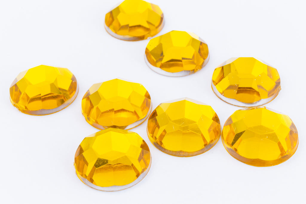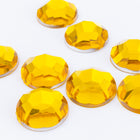 Acrylic faceted round topaz rhinestone with flat foiled back.