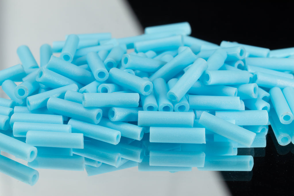 Size 1 smooth bugle in matte iridescent turquoise blue.