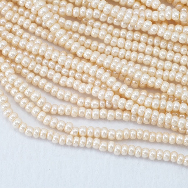 Size 13/0 (1.7mm) glass seed beads in opaque Ceylon eggshell.