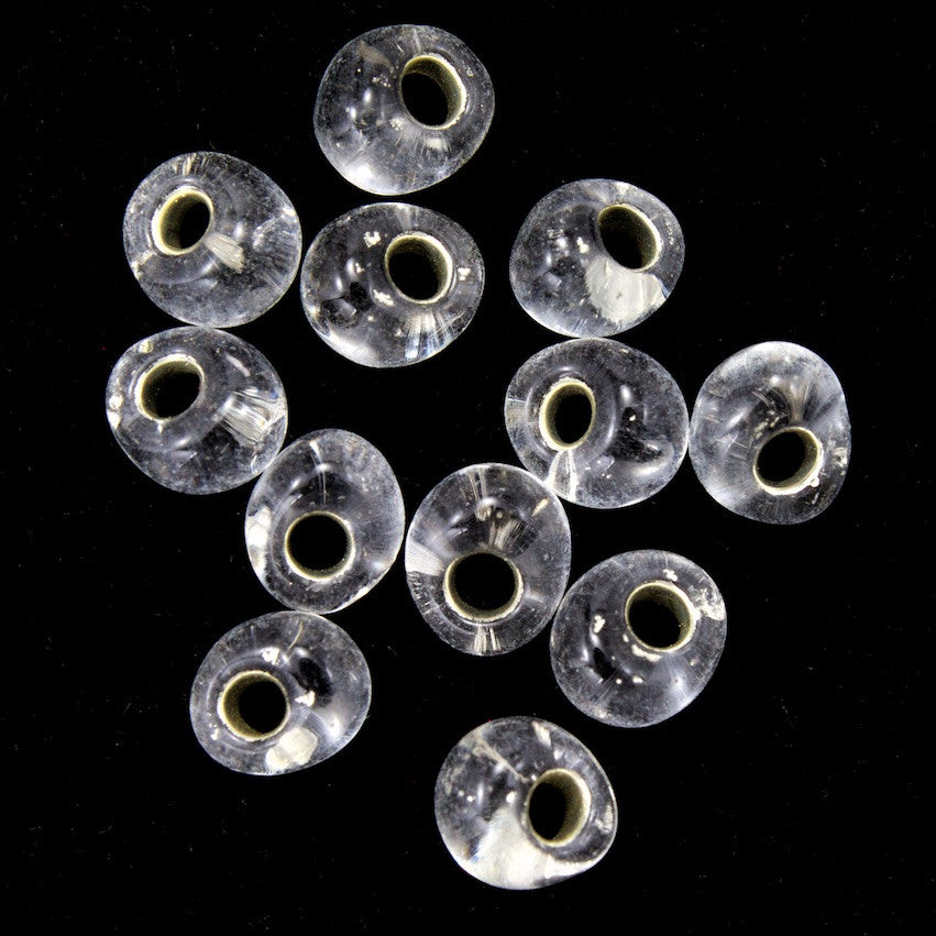 Round beads with off-center hole, makes a zig-zag effect when strung together.