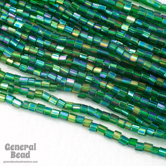Size 11 faceted hex cut six sided seed bead in transparent iridescent emerald.
