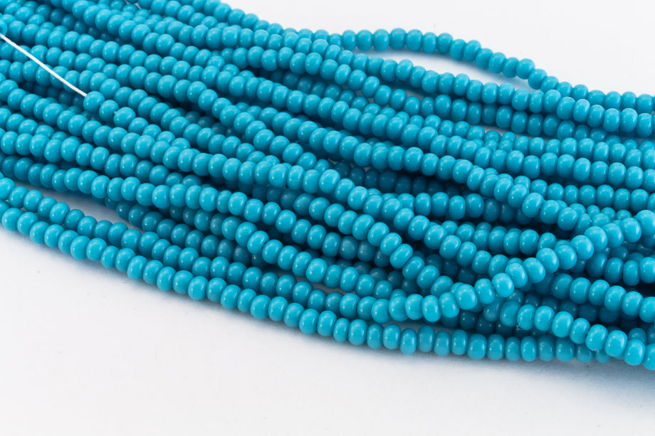 Size 3 (about 5.6mm) opaque blue turquoise seed beads.