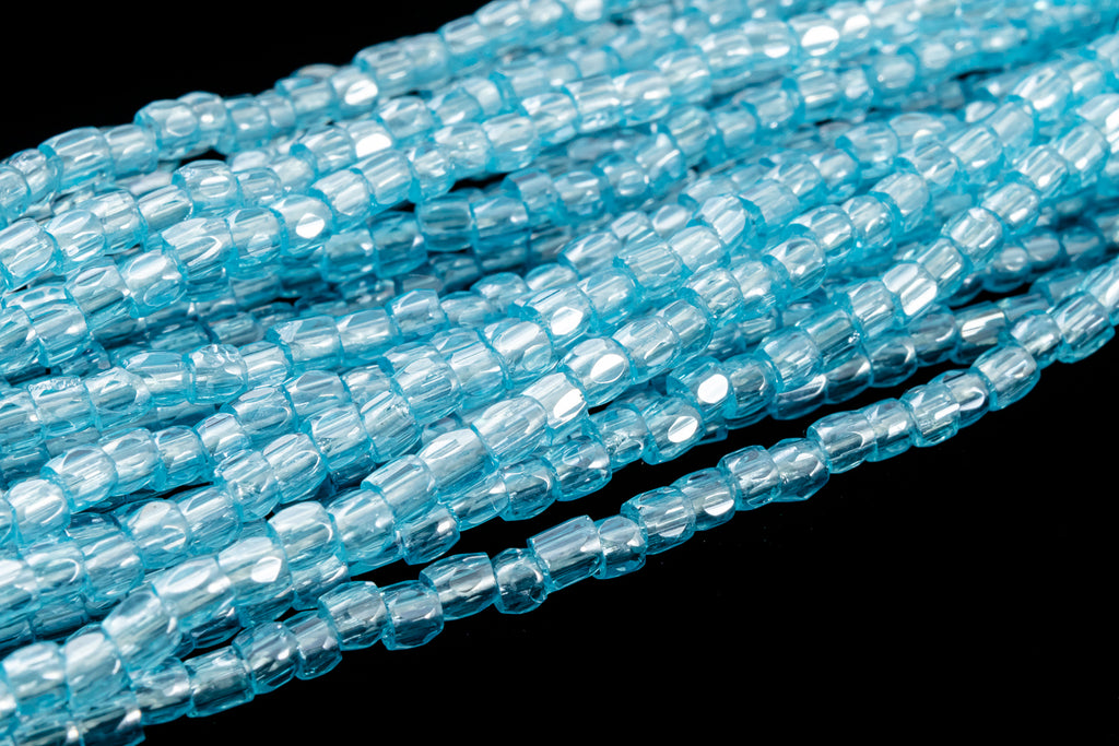 Size 9/0 (2.6mm) 3-cut glass seed bead in transparent sky blue luster.