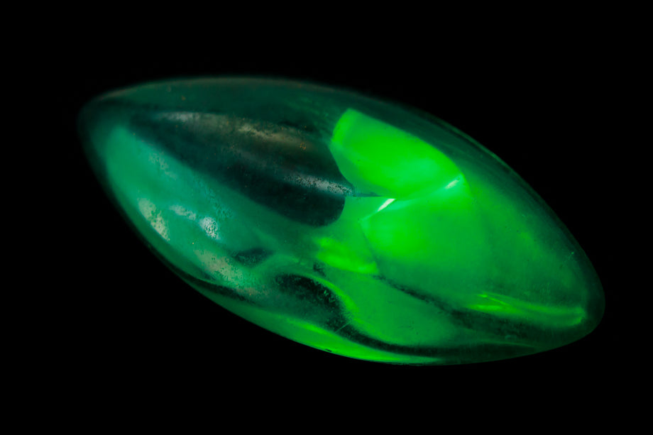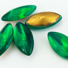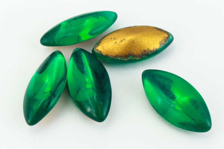 7mm x 15mm emerald smooth navette point back cabochon with gold foiling.