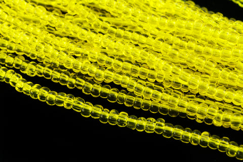 Size 13/0 Charlotte cut transparent yellow glass seed beads.