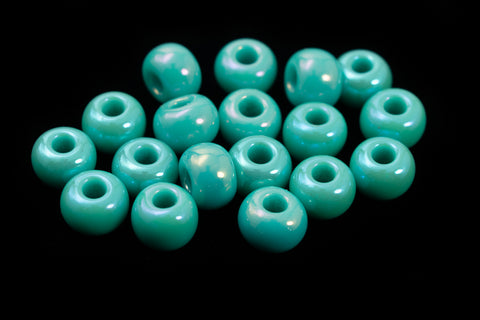 Size 6 opaque iridescent green turquoise seed beads.