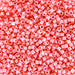 Size 11/0 rose pink lined iridescent crystal cylinder seed bead.