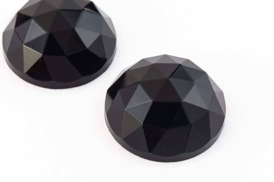 13mm faceted round jet black high dome with flat back.