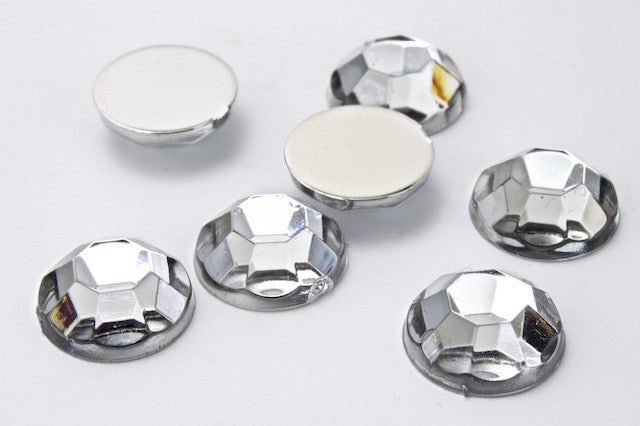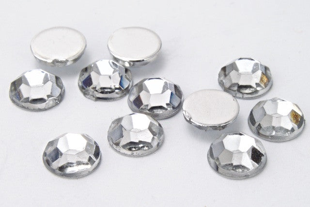 Acrylic faceted round crystal clear rhinestone with flat foiled back.