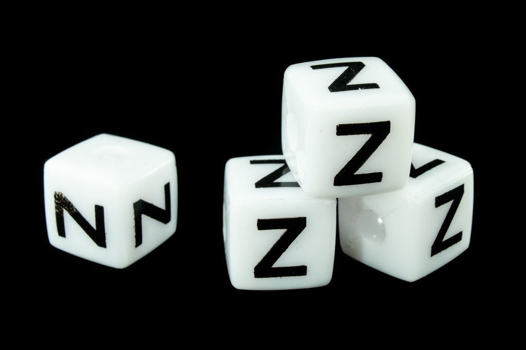 11mm white plastic cube beads with black letter "Z" on four sides.