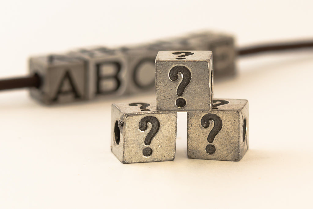 6.55mm pewter cube beads with engraved question mark on four sides.