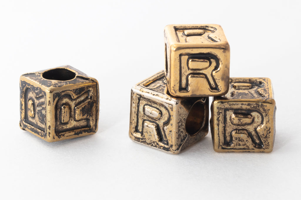 6mm metallic gold plastic cube beads with indented letter "R" on four sides.