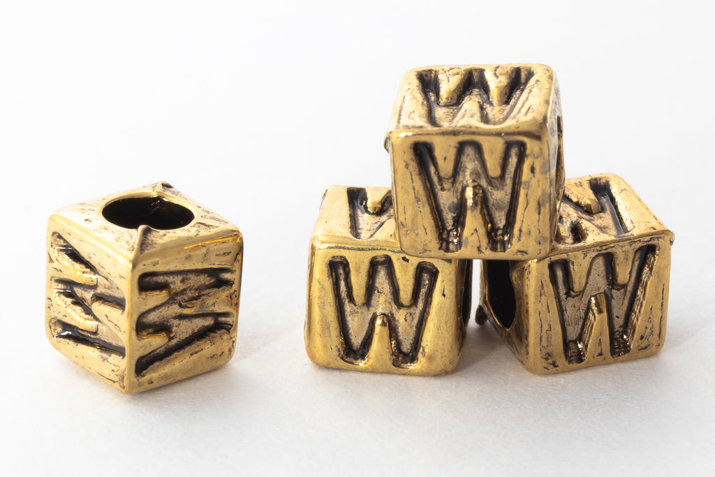 6mm metallic gold plastic cube beads with indented letter "W" on four sides.