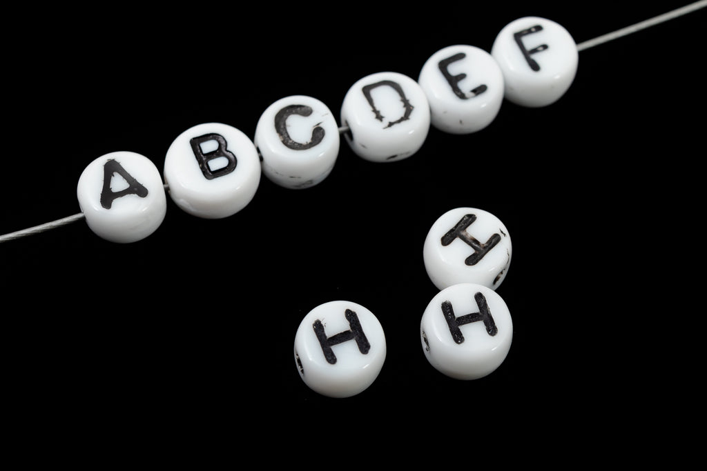 6mm white plastic "baby" beads with black letter "H" on both sides and 1mm sideways hole.