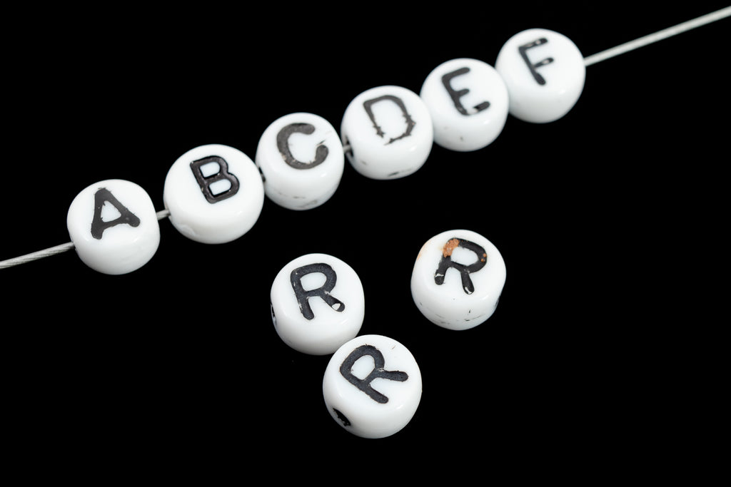 6mm white plastic "baby" beads with black letter "R" on both sides and 1mm sideways hole.