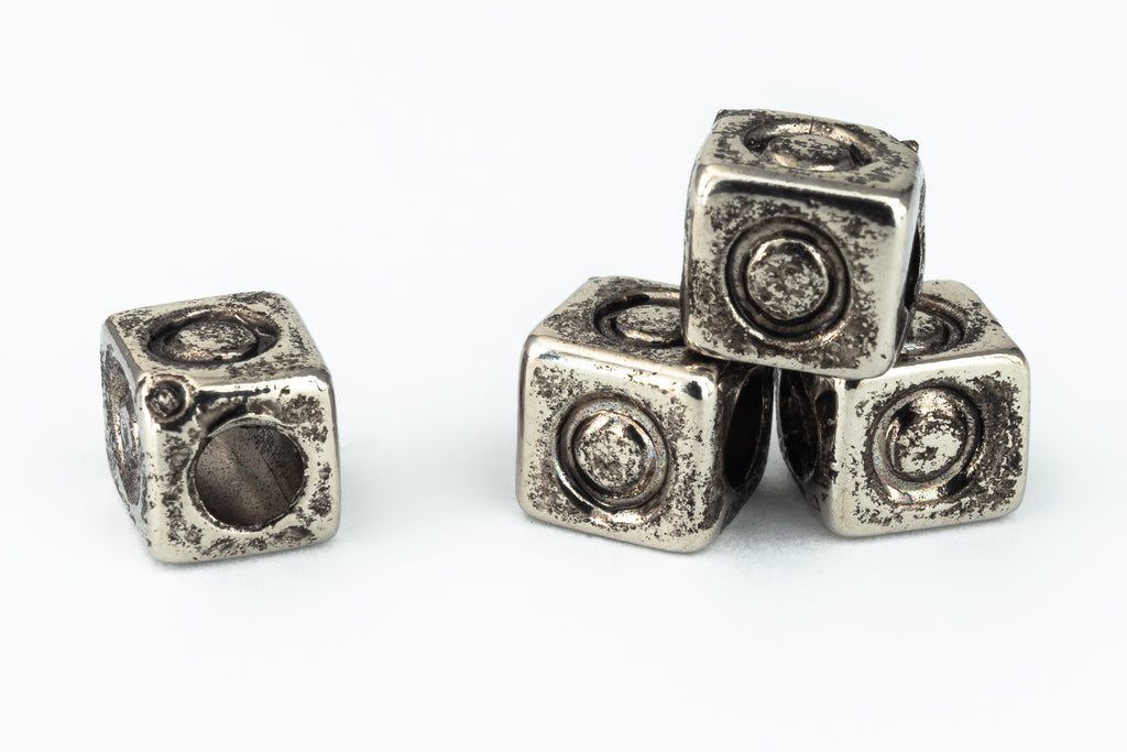 6mm metallic silver plastic cube beads with indented number "0" on four sides.