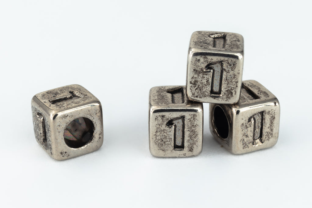 6mm metallic silver plastic cube beads with indented number "1" on four sides.