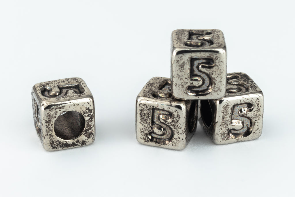6mm metallic silver plastic cube beads with indented number "5" on four sides.