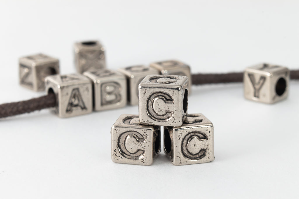 6mm metallic silver plastic cube beads with indented letter "C" on four sides.
