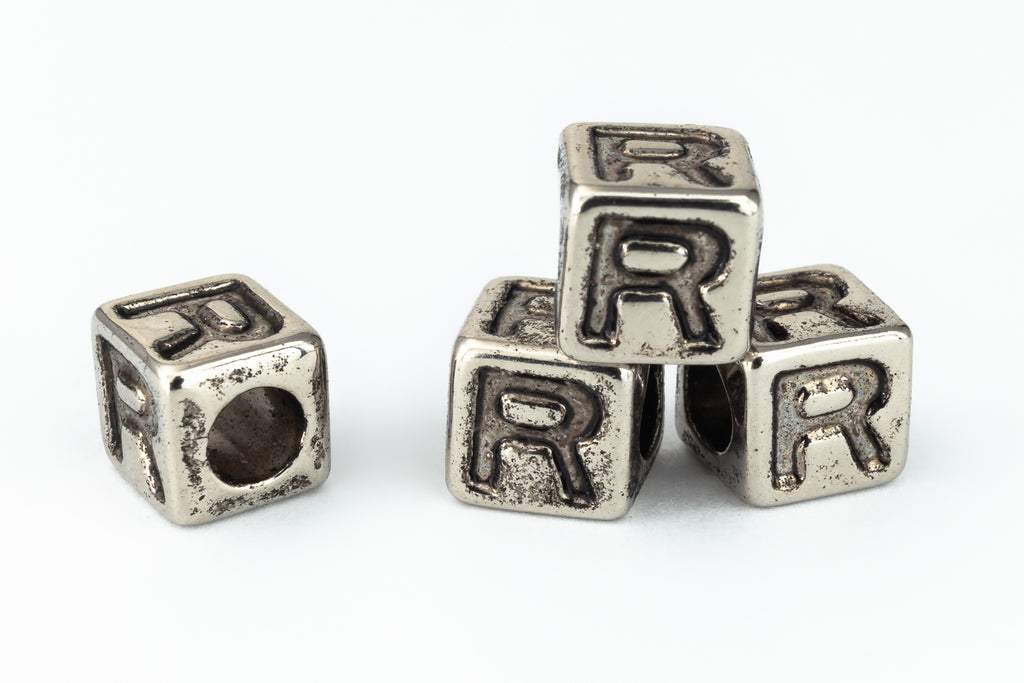 6mm metallic silver plastic cube beads with indented letter "R" on four sides.