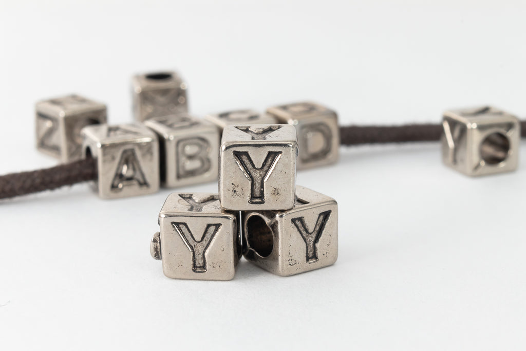 6mm metallic silver plastic cube beads with indented letter "Y" on four sides.