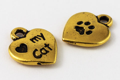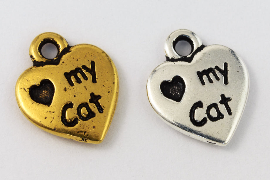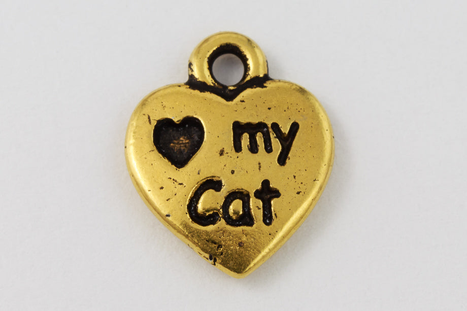 10mm x 12.75mm antique gold heart with "Love my Cat" inscription on one side and a paw print on the other.  1.5mm loop at top.