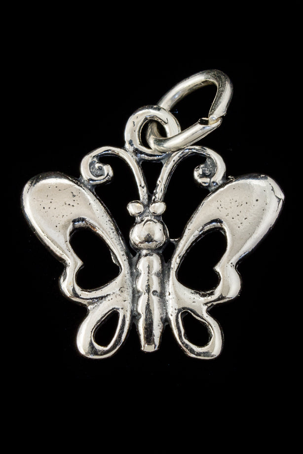17mm x 16mm butterfly with cut out wings, has loop and 4mm open jump ring.