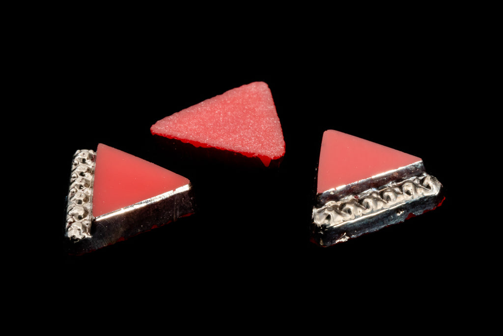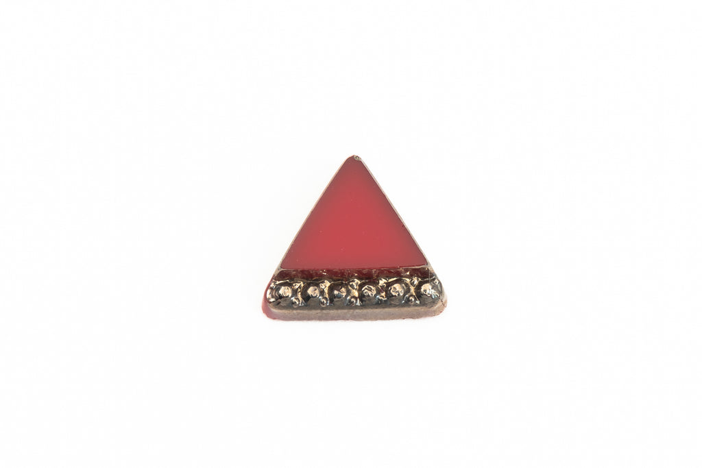 7.13mm x 7.8mm opaque red triangle flat back.One side has lowered edge with beaded border and gunmetal coating.