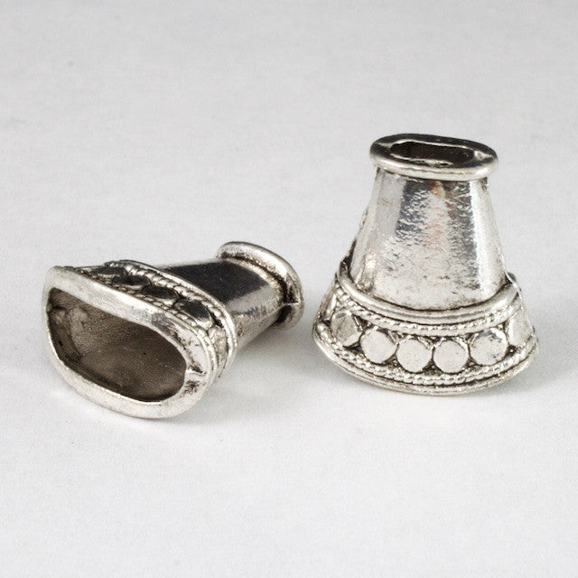 15mm x 16mm antique silver flattened oval cone with decorative circle border.