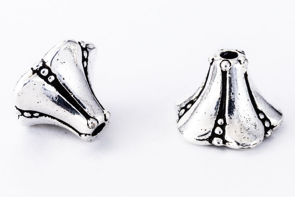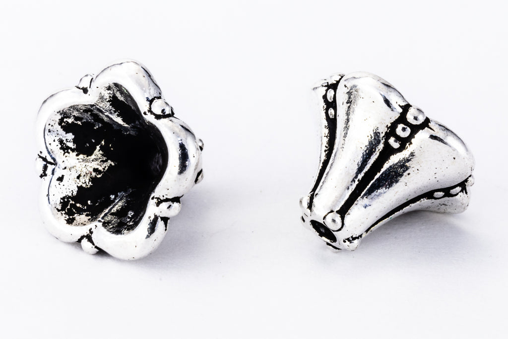 8.5mm x 12mm antique silver cone shaped like a bell flower with 1.25mm hole.
