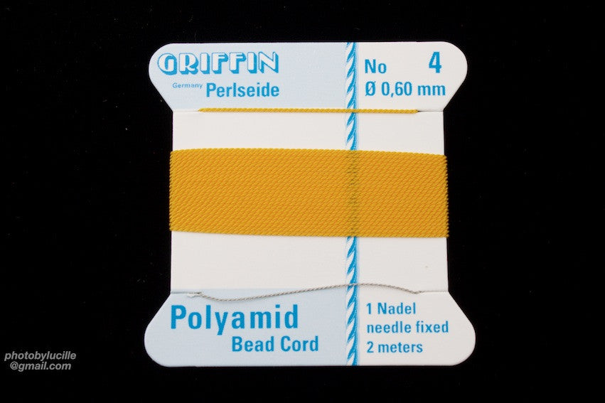 Nylon pearl cord with attached wire needle for bead stringing.