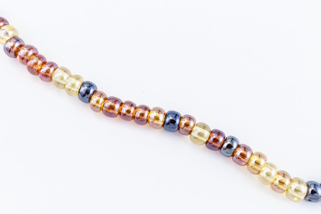 Size 6 transparent tortoise mix seed beads with luster finish.