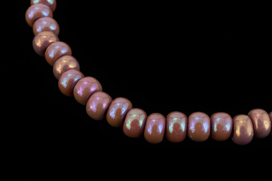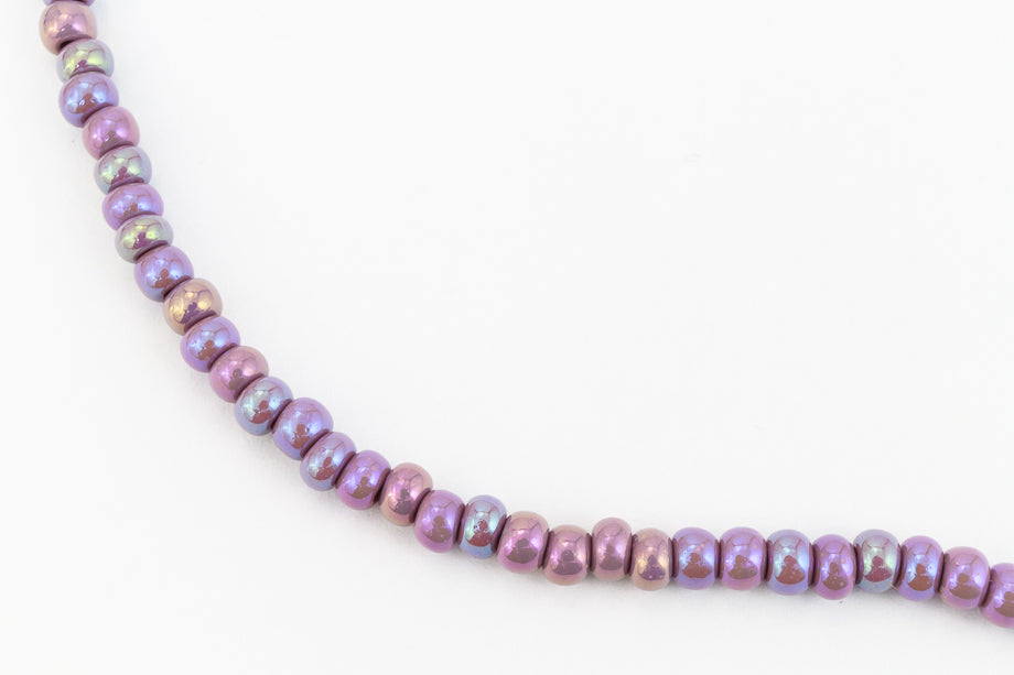 Size 11 opaque iridescent mauve seed bead.
