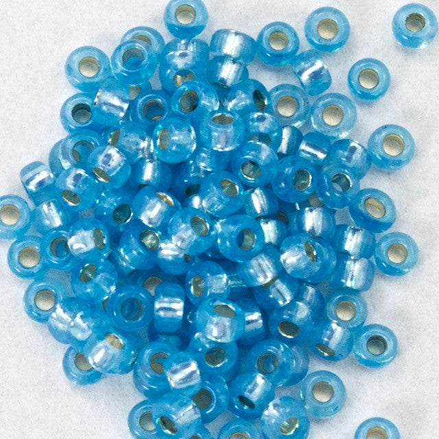 1.5mm 15/0 opalescent gold lined sky blue seed bead.