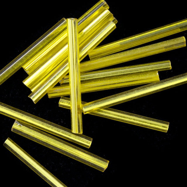 Glass bead- 25mm silver lined yellow bugle.